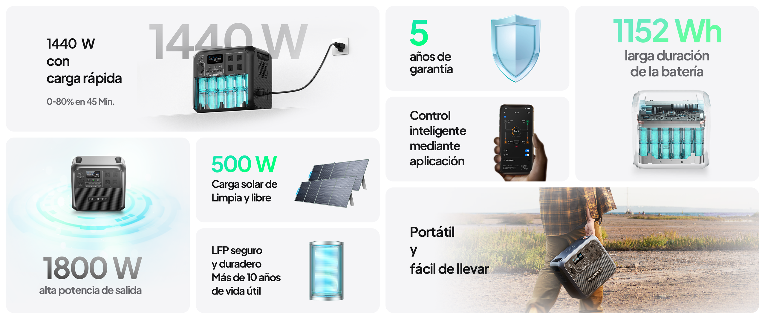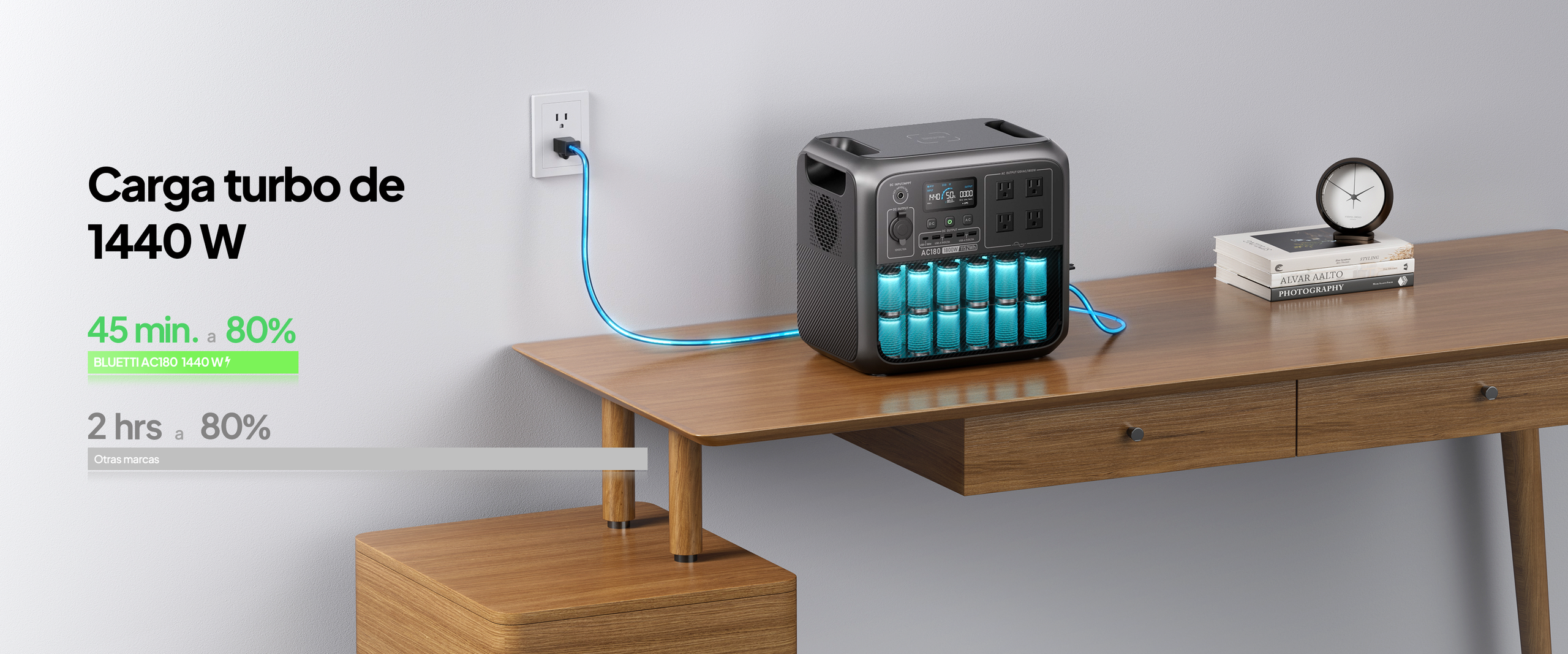 La AC180 admite una entrada de hasta 1440 W. Conéctala a una toma de pared, activa el modo de carga turbo en la aplicación BLUETTI y podrás cargarla en 1,3-1,8 horas.