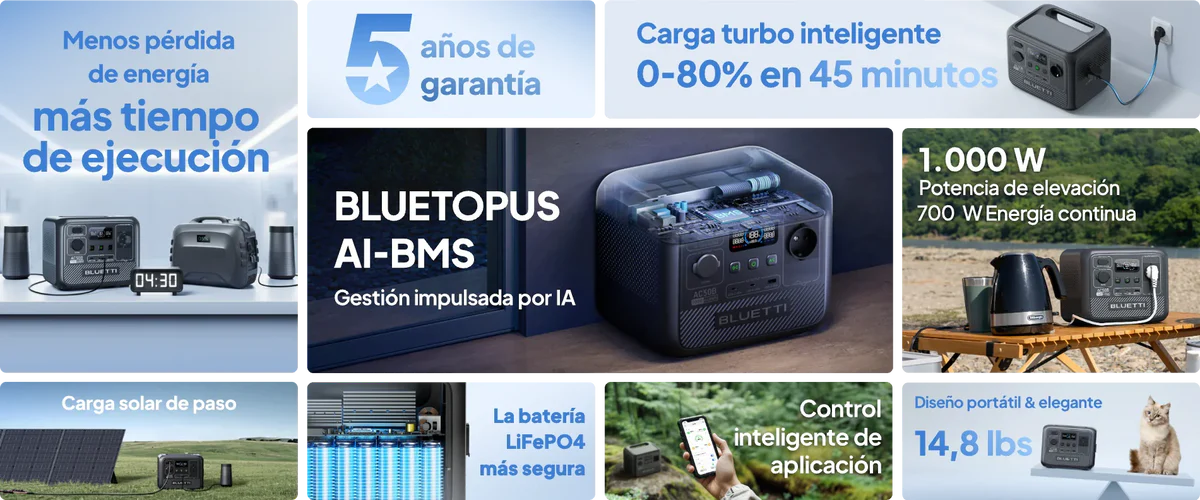 • 6 formas de recargar:(CA/Solar/Coche/Generador/Batería B80/CA + Solar)