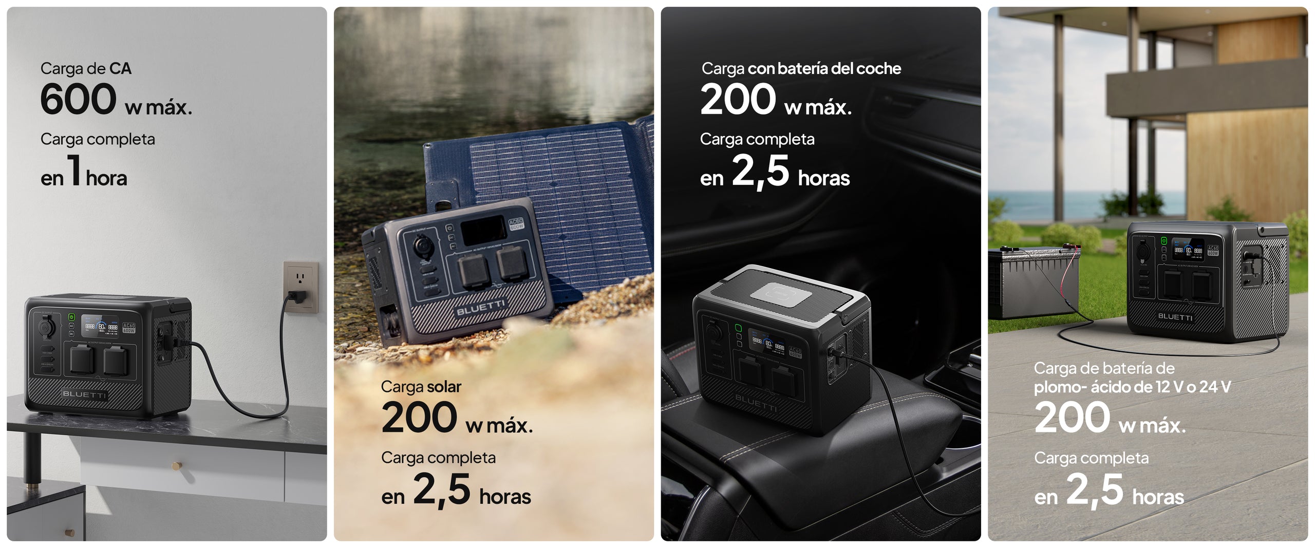 Estos son los modos de carga de CA del AC60. Cada modo tiene una potencia de entrada y un tiempo de carga diferentes, como se indica en la siguiente tabla.